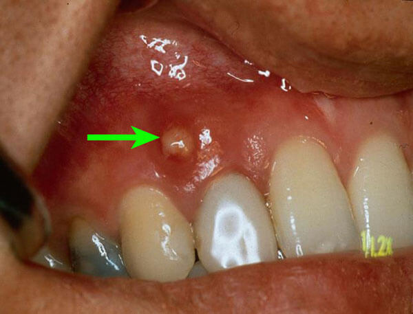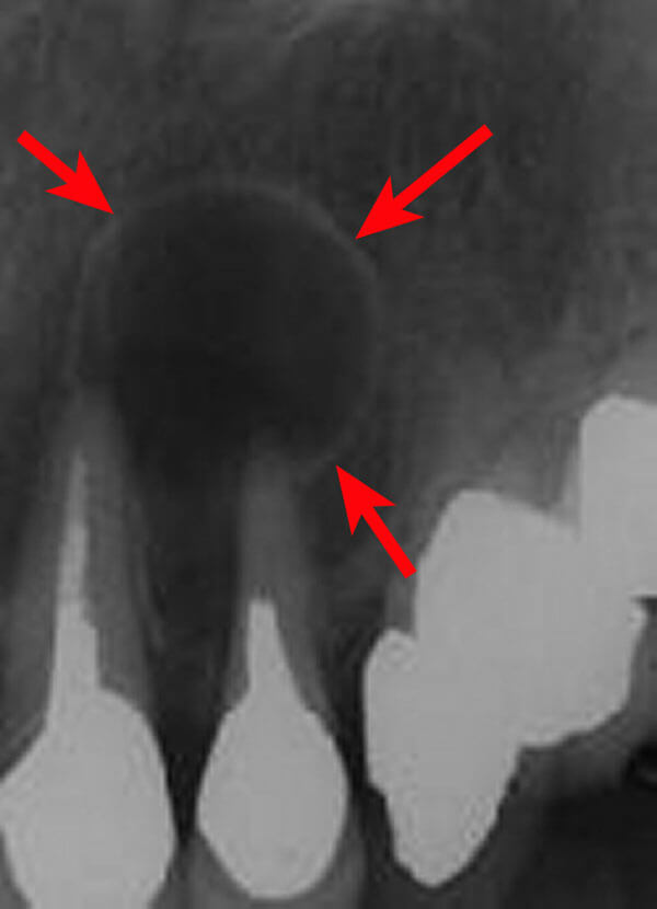 歯の根の先に嚢胞ができ、歯茎に膿の出口を形成しています。
