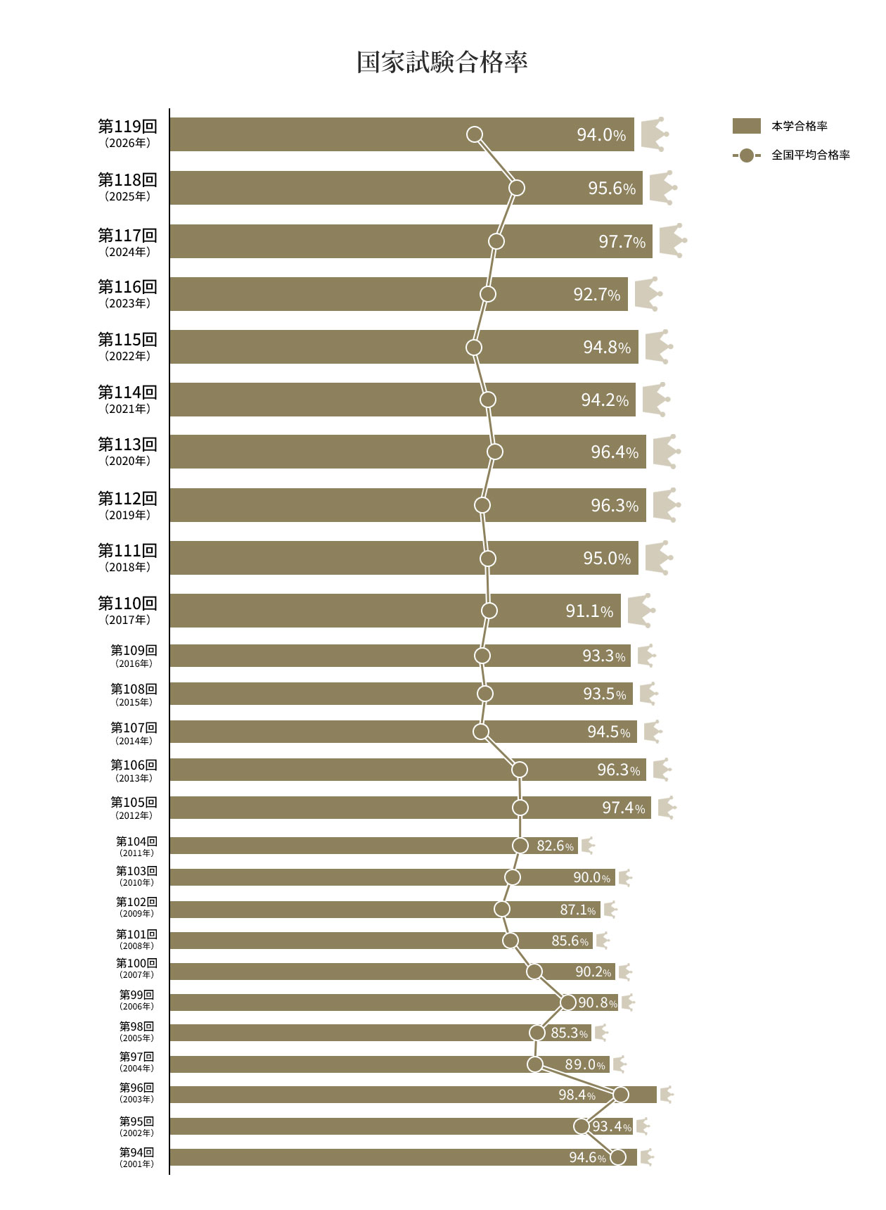 低学年からの充実したサポートによって学生個々が積み上げた知識は、本番で発揮され、 26年連続No.1という合格率に如実に表れています。