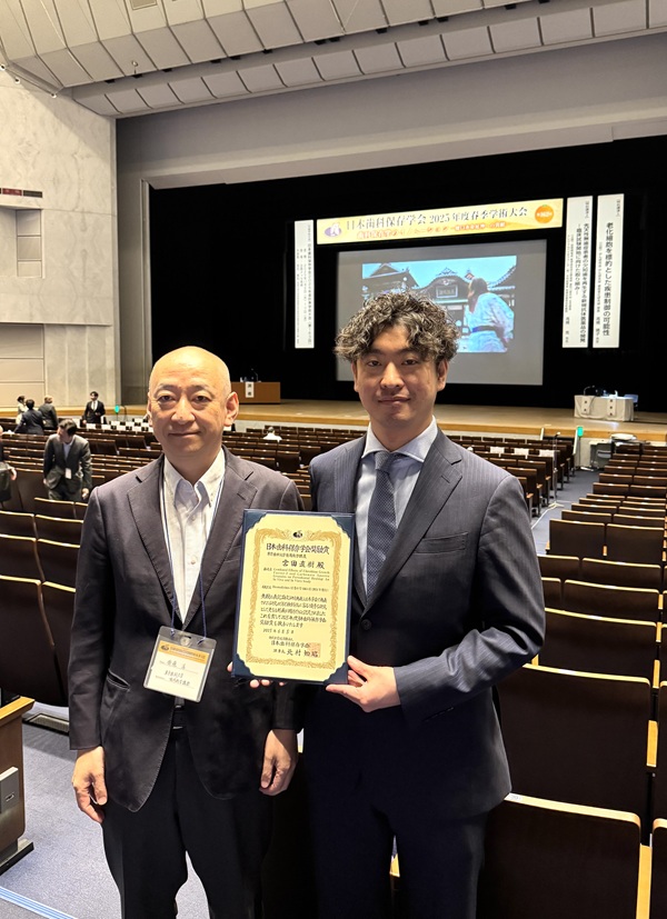 2025年6月5日(木)から6日(金)に、松山市の愛媛県県民文化会館において開催された日本歯科保存学会2025年度春季学術大会(第162回)にて、歯周病学講座の宮田直樹助教が日本歯科保存学会奨励賞を受賞した。本賞は、歯科保存学の領域において優れた業績をあげた日本歯科保存学会の会員を表彰するとともに、若手研究者の育成を目的に,雑誌掲載論文を審査対象とし、表彰するものである。