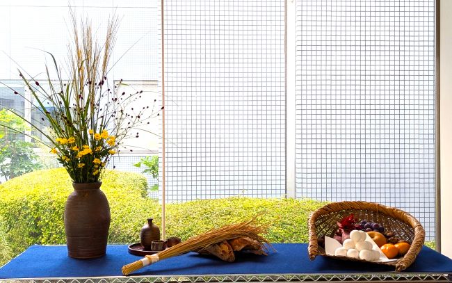 市川総合病院では、毎月季節の室礼(しつらい・飾りつけ)を外来棟1階の渡り廊下に行っています。