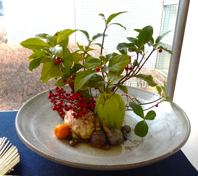 舞手柑(まいてかん[仏手柑])はおめでたい時に舞うような手の動きを表しています。南天の赤い実は厄除けと難を良い方向に転じます。百合根は和合果(わごうか)ともいい、一つの球根に芽が二つ出ることから仲が良い事を表します。零余子