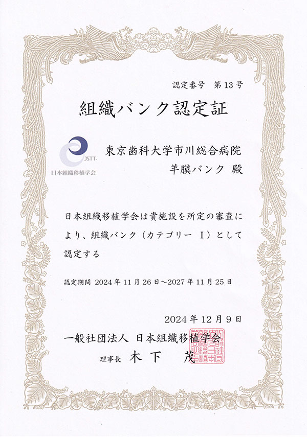 当院眼科は、国内では先駆的に保存羊膜移植を行っており、数多くの実績があります。その為、羊膜の提供から保存、移植、その後のトレーサビリティーまで一連の工程の質を担保する機能を有した、いわゆる「バンク」の設置が必要不可欠であると考え、2014年に羊膜バンクを設立、その後、日本組織移植学会認定組織バンク認定委員会の査察を受け、2015年11月26日付けで、「東京歯科大学市川総合病院羊膜バンク」として組織バンク(カテゴリーⅠ)認定を受けました。