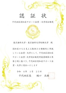 令和6年1月25日付けで本学ならびに短期大学が千代田区より「千代田区認知症サポート企業・大学」に認証されました。 ⇒ 千代田区ホームページ「認知症サポート企業大学 認証企業・大学一覧」へのリンク