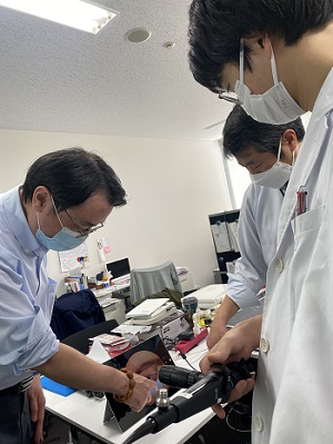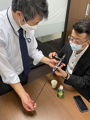 Dr. Kopin Luo receiving an explanation of the swallowing endoscope.